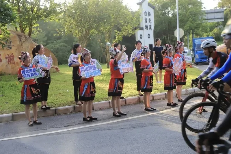 横河畲族姑娘为骑友加油。