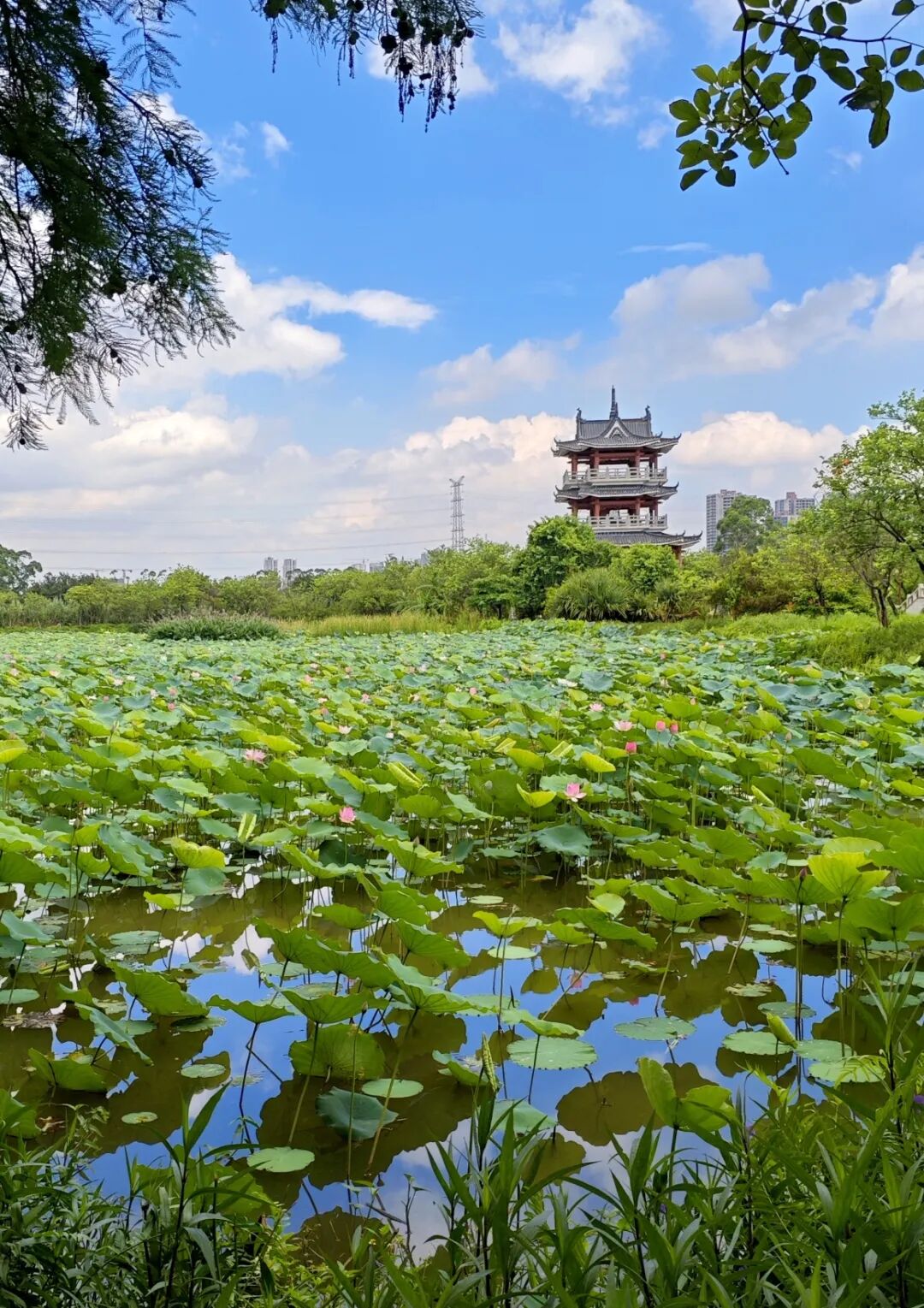 在古梅生态农业园,又是另一番开阔的景象。开阔的水塘里荷叶碧绿连片,生机盎然。粉红、洁白的荷花从层叠的绿叶间探出头来,在微风中轻轻摇曳。