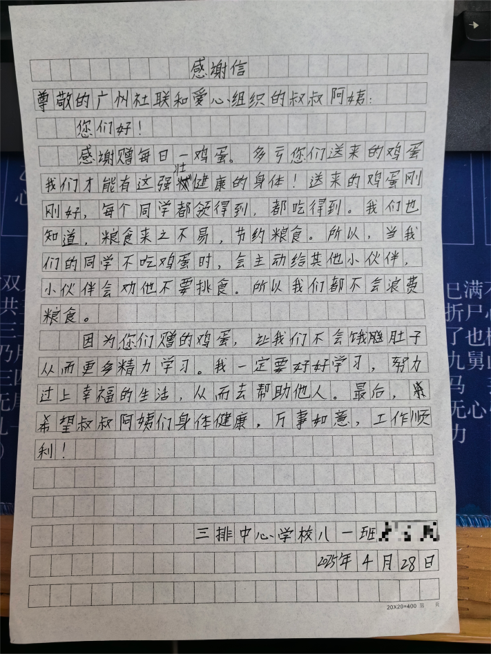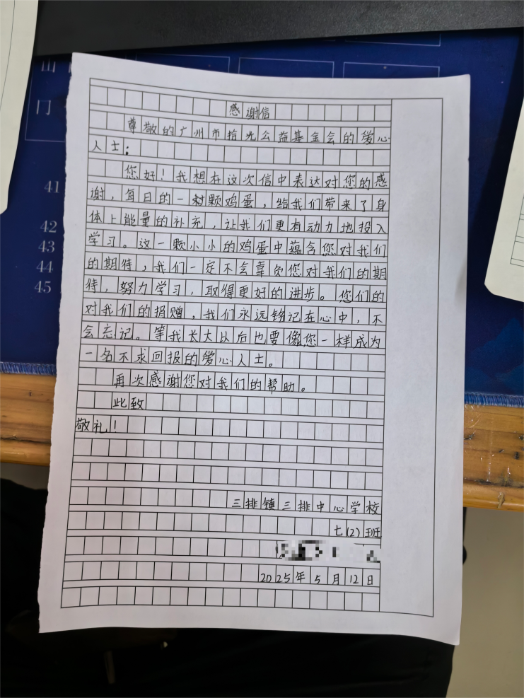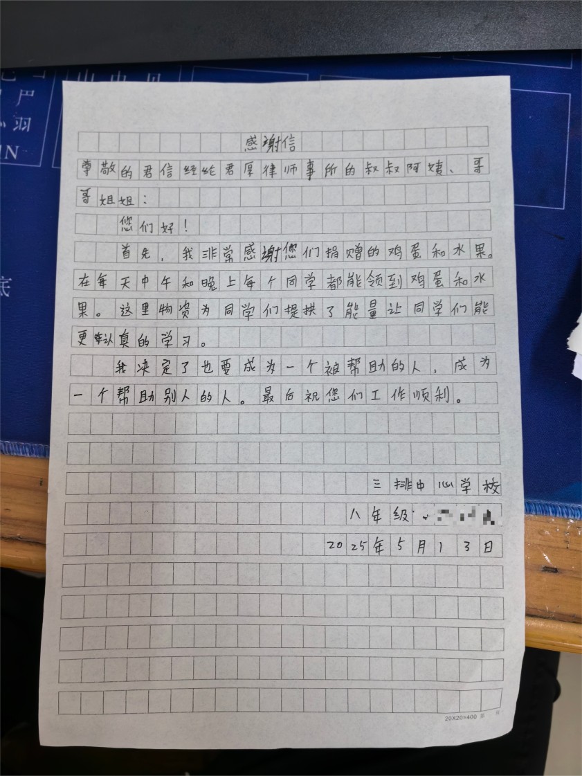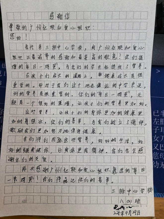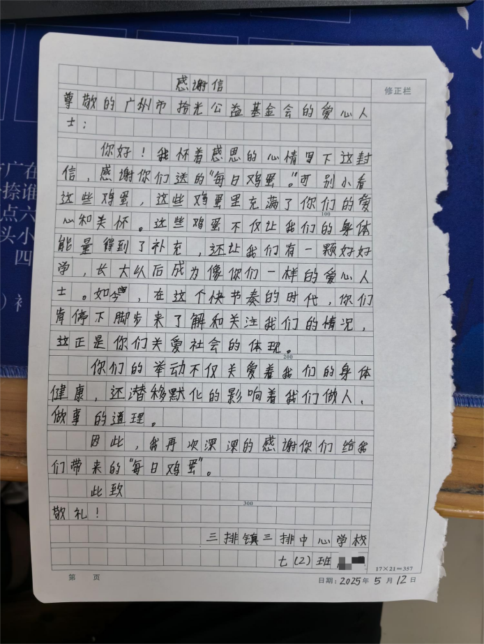 自“每天一鸡蛋”行动落地实施以来,该项目深受学校老师和学生们的喜爱,为莘莘学子带来了切实的营养关怀。面对这份营养爱心,学生们心怀感恩,以一封封情真意切、饱含深情的感谢信,表达着对“每天一鸡蛋”行动的由衷喜爱,以及对捐赠方的无尽感激之情。这些感谢信,不仅是对项目实施成效的肯定,更是社会各界爱心传递的美好见证,希望激励更多的人加入到关爱青少年健康成长的行列中。