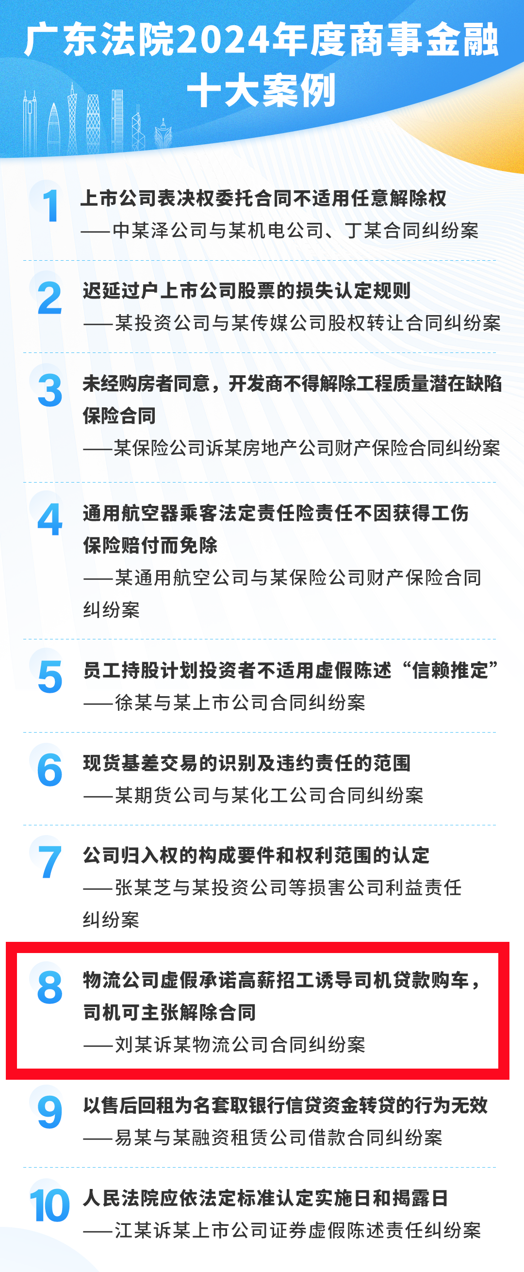 近日,广东省高级人民法院发布广东法院2024年度商事金融十大案例。其中,东莞法院的《物流公司虚假承诺高薪招工诱导司机贷款购车,司机可主张解除合同——刘某诉某物流公司合同纠纷案》入选。