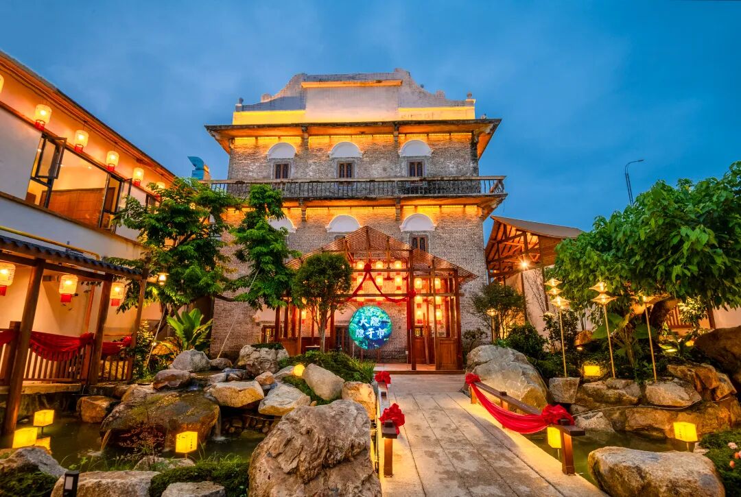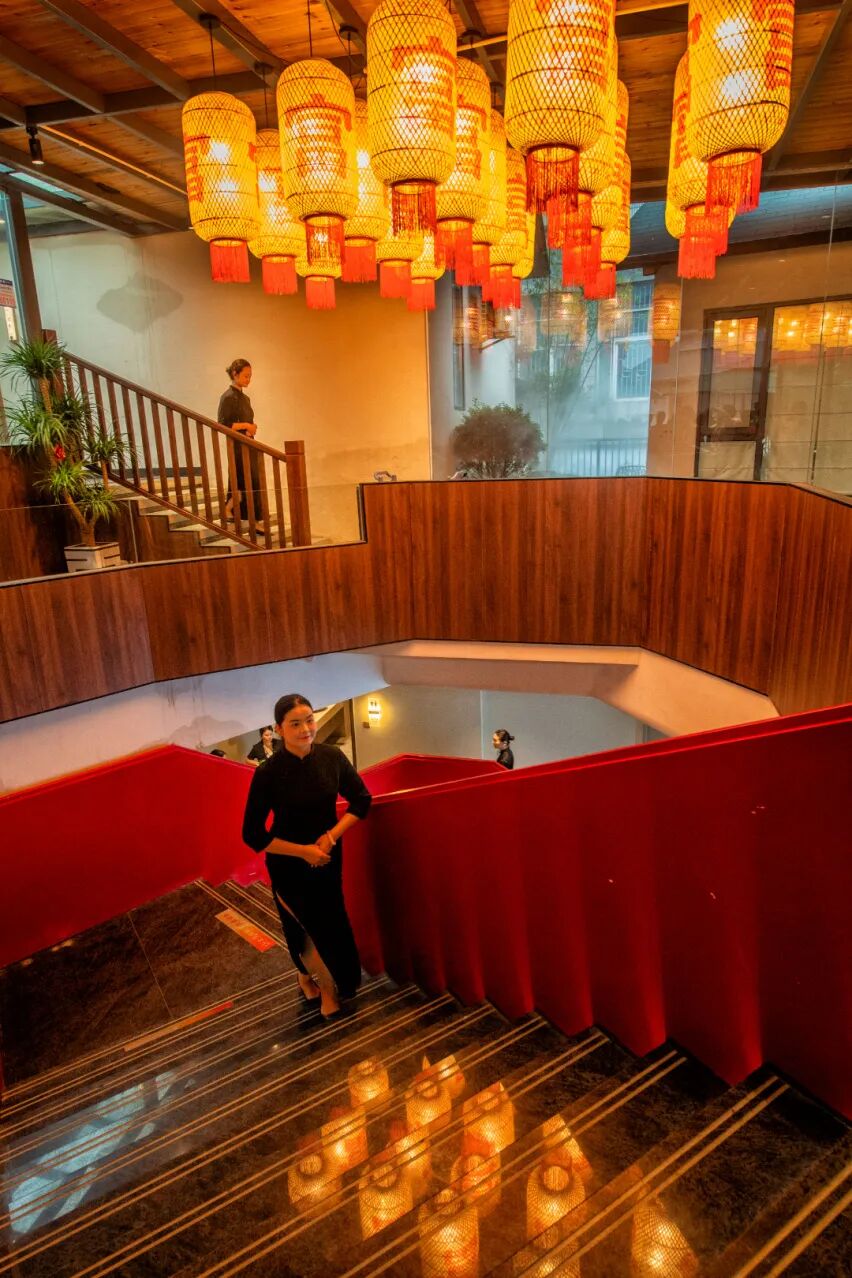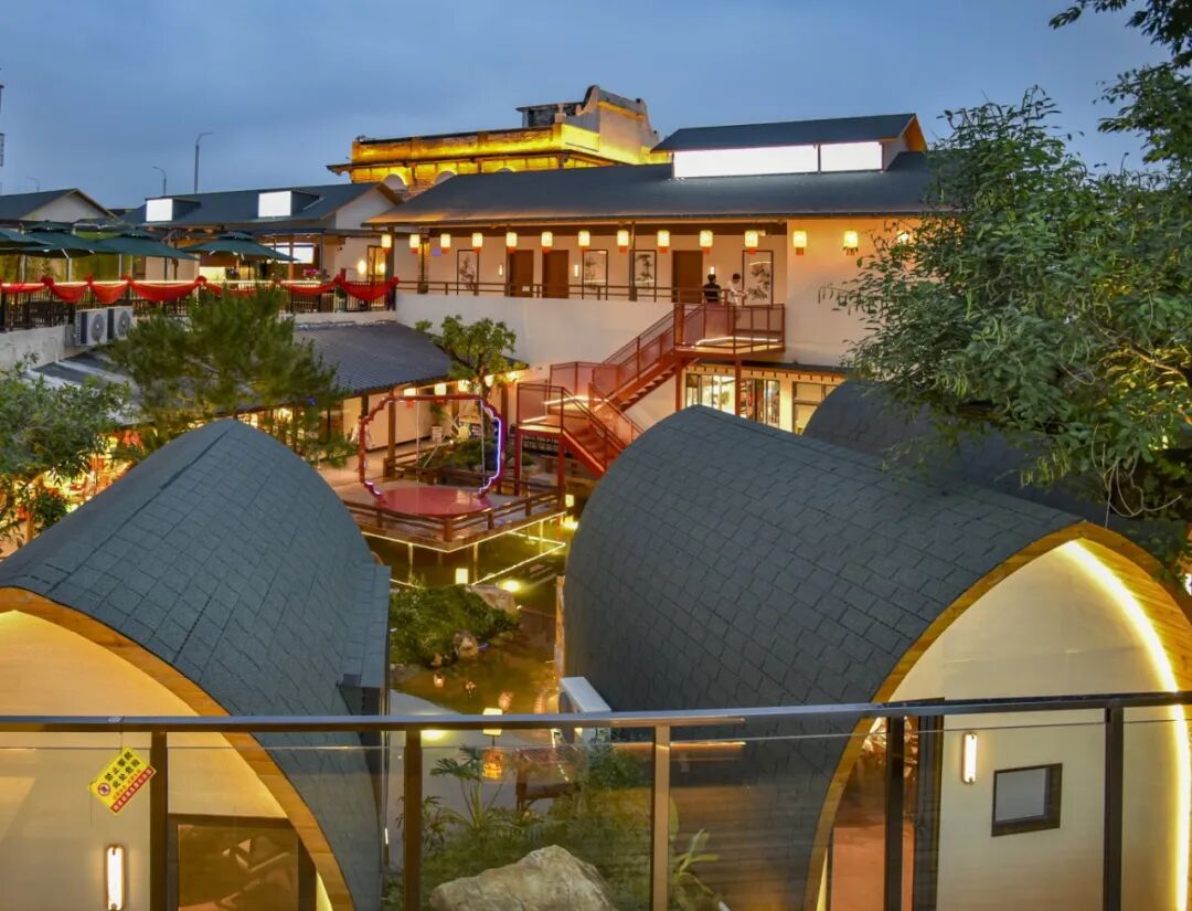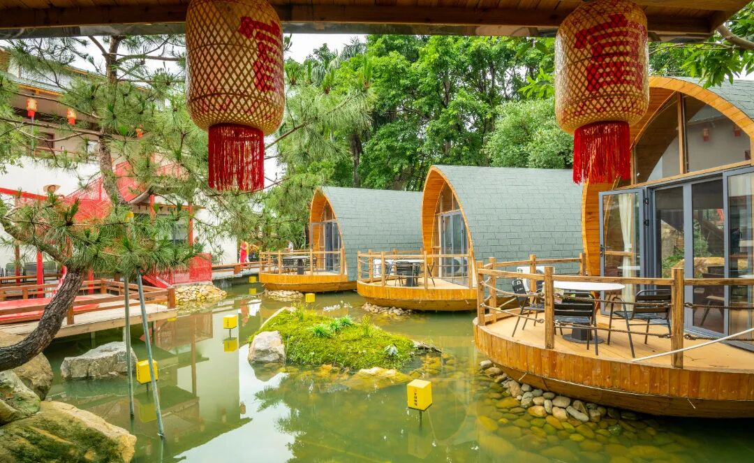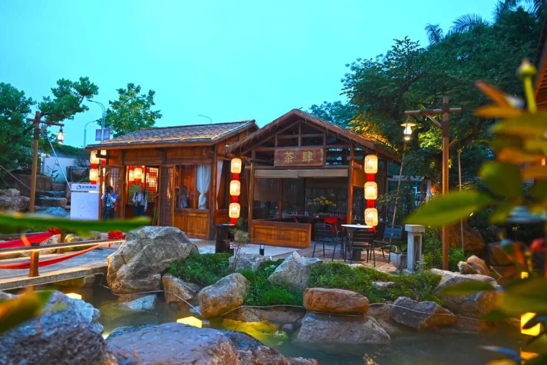 穿过长廊,可见亭台楼阁临水而建,流水穿梭于山石之间。一座形似拱桥的水上小屋,点缀着红绸和灯笼,内设桌椅供人休憩,让人重新找回与自然、与传统、与内心的对话。