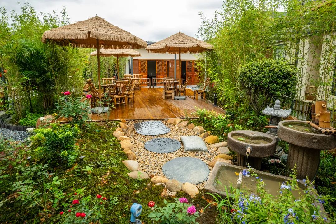 庭院二楼设有一处静谧空间——茅草伞下摆放竹制桌椅,四周绿植环绕,石板小径蜿蜒,苔藓覆石,配以灵动水景,氛围清幽闲适。