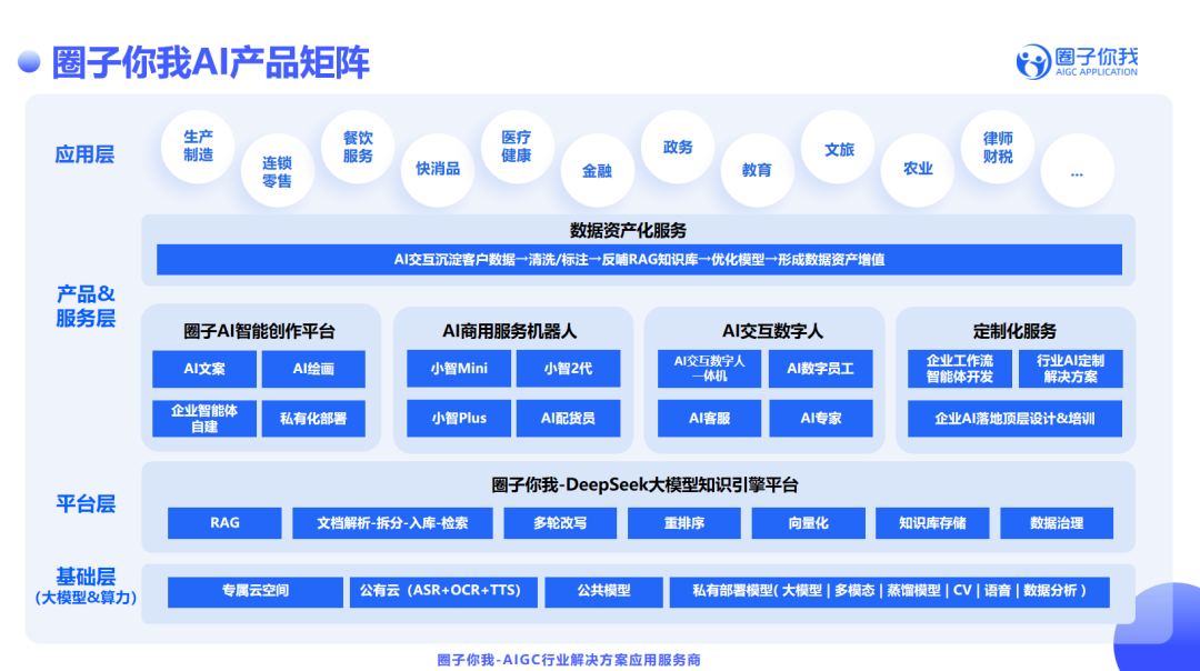 圈子你我AIGC 则以独特的创新视角和前沿技术,专注于人工智能在社交、政务、商业等行业场景的应用。公司依托自主研发的DeepSeek大模型知识引擎,深度融合RAG(检索增强生成)、知识库构建、智能体协同等前沿技术,为政企客户提供涵盖AI智能创作平台、商用服务机器人、交互数字人及定制化AI应用开发的全栈式智能化解决方案。此次入选重点企业名单,是对圈子你我技术实力和市场潜力的高度认可。未来,公司将进一步进一步深化AI与行业场景的融合创新,拓展AI应用场景落地,致力于成为人工智能领域的标杆企业。