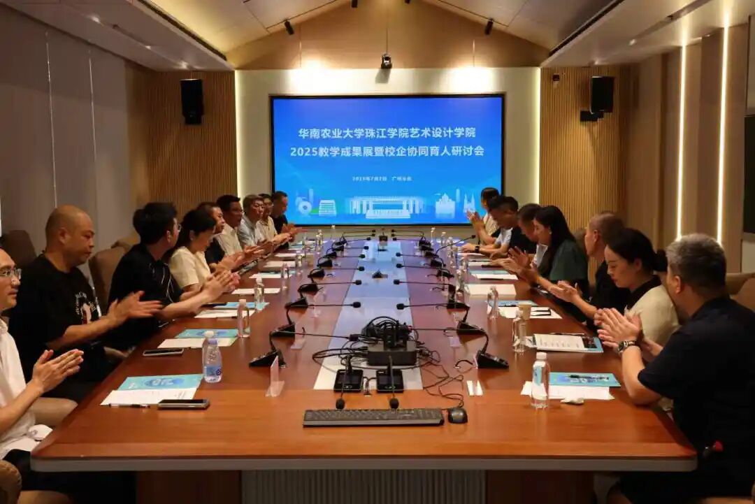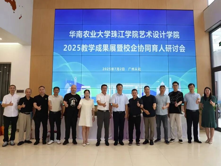 2025年7月2日上午,在华南农业大学珠江学院、新视界设计产业学院的大力支持下,艺术设计学院“2025教学成果展暨校企协同育人研讨会”在华南农业大学珠江学院图书馆一楼学术交流中心举行。校长王建武、学生工作处处长周玲军出席会议,会议由艺术设计学院何新闻院长主持。本次会议邀请了广东合生雅居智能家居有限公司王天兵董事长,广州市古玩行业协会会长、广州漆彩文化传播有限公司董事长陈国裕,广州市古玩行业协会党支部书记邝玉明,广州市古玩行业协会监事、广州怀德堂餐饮有限公司总经理陈永坚,广东轩辕网络科技股份有限公司黄永健副总裁,悦时代建筑空间设计(广州)有限公司徐进乐总经理,广东教育百捷投资有限公司张绍杰总监,广州鼎晨文化传播有限公司陈奇勋总经理,佛山英吉利电器有限公司杨敏杰营销总监等企业专家莅临,除此之外学院陈舒舒教授及各教研室正副主任共同参与研讨。