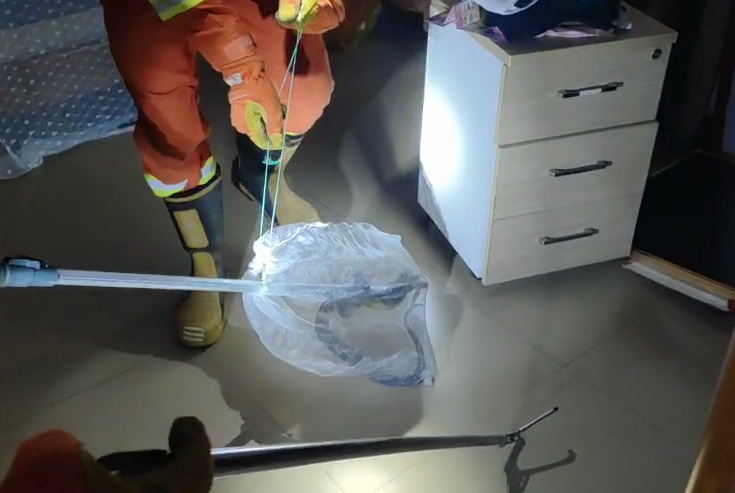 消防救援人员到场后,在户主的指引下发现:一条体长约一米的眼镜蛇正藏在床头柜底下“蹭空调”,看到救援人员进房间后发出嘶嘶嘶的警告。消防员做好个人防护后利用捕蛇器控制住蛇头,随后小心将床头柜移开,在确保安全的前提下将其平稳放入透气编织袋中,整个抓捕过程耗时不到三分钟。