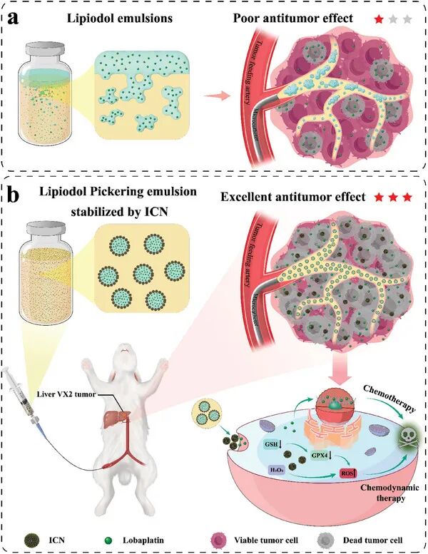 研究团队制备的新型碘化油皮克林乳液(ICN-LPE)在TACE治疗肝癌中的作用机制。图示ICN稳定乳液、持续释放化疗药物及催化产生活性氧(ROS)进行化学动力治疗。