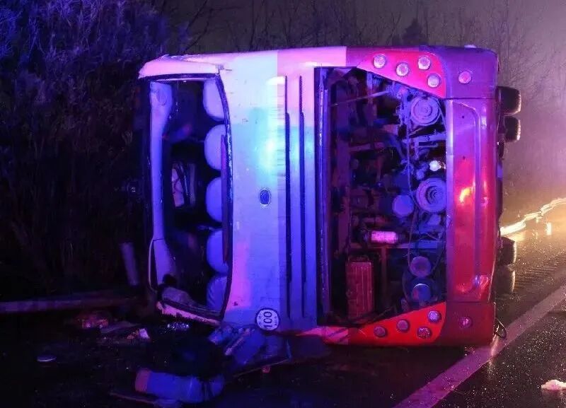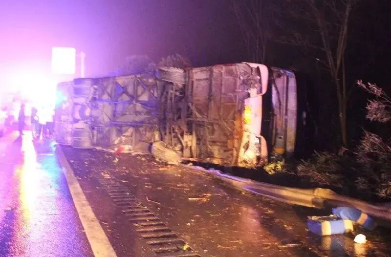 事故发生时,车上共有56名乘客,造成1名乘客当场死亡,多名乘客不同程度受伤,车辆及道路交通设施也受到损坏。经调查,事故原因是驾驶员疲劳驾驶。最终,驾驶人郭某及车属企业的三名相关责任人被依法追究刑事责任!
