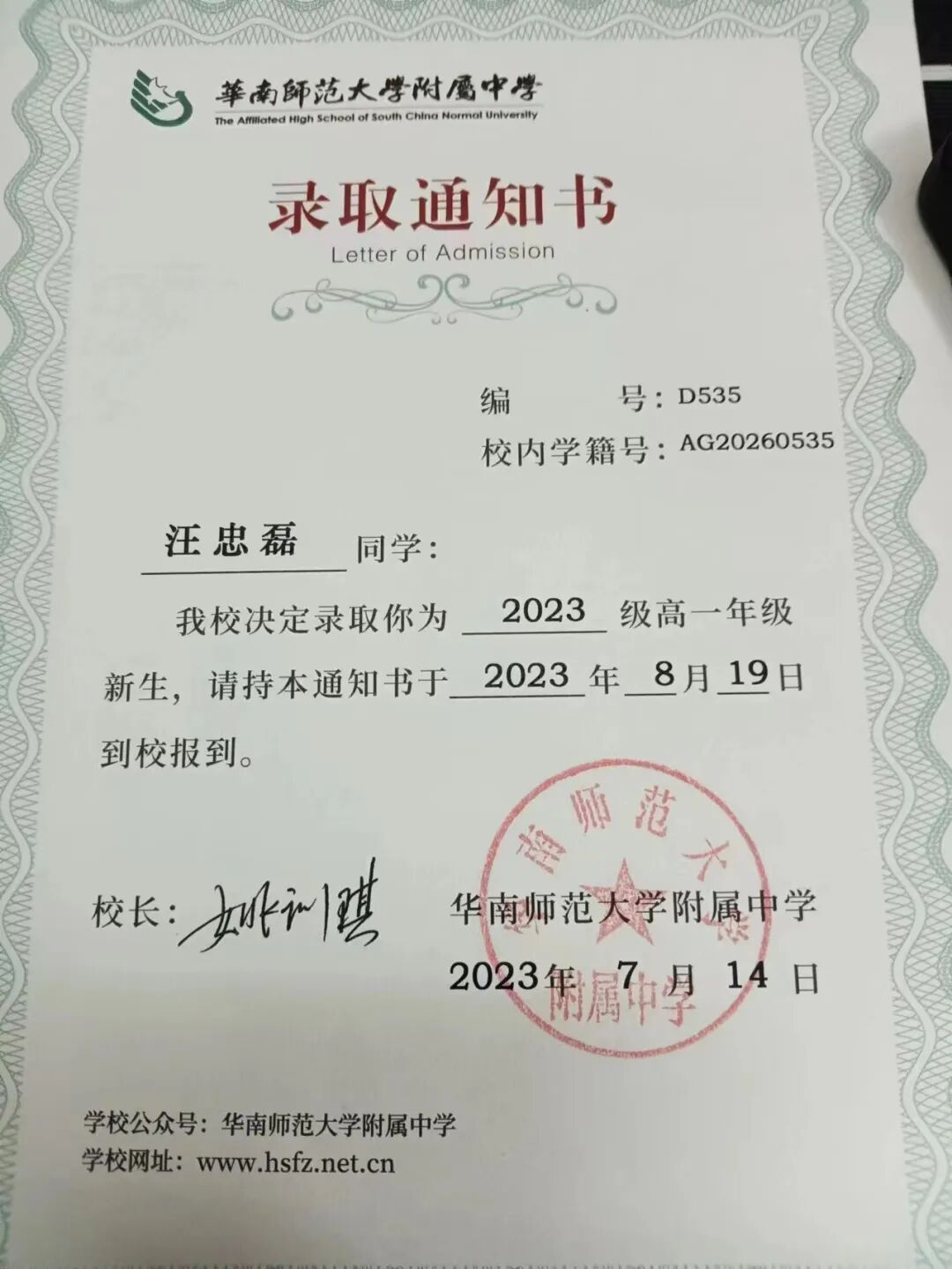 至于学校初中部,中考成绩同样表现突出。2024年试题难度上升,总平均分不降反升11分,高市平均分99.3分(花都区教育局统计),位列全区前茅。其中,汪忠磊、曾泳溢等优秀学子被海军与华师附中联合举办的海航实验班自主招生录取(全省仅录取40人)