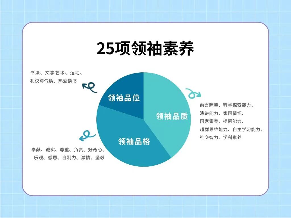 学校秉承“为有领袖素养而教育”之理念,既致力于国家课程的高效学习,又通过建设多样化课程,满足学生全面、多元、特长发展的需求,尤其重视培养学生高尚的品格、过硬的品质和优雅的品位,努力使每一个孩子拥有领袖人才之素养。