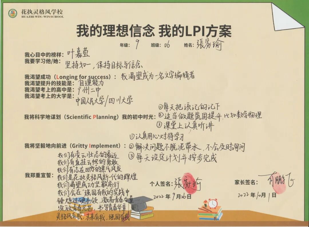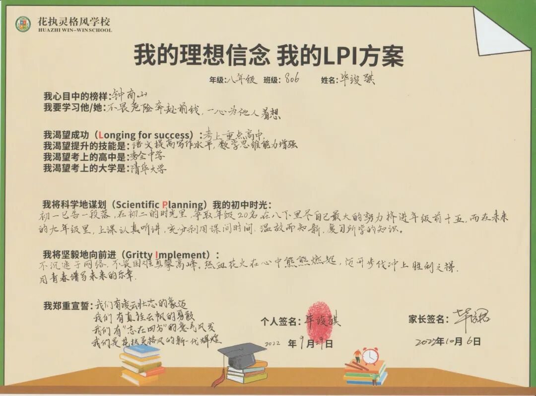 创设LPI项目,设置“不忘誓言,坚毅前行”的誓言墙,培养学生的目标思维。