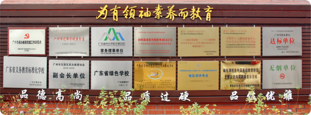 此外,学校多次荣获花都区中考突出贡献奖。学校坚持特色教育,先后获评多项称号,如:花都区“剑桥英语官方授权考点”;花都区“全国幼儿及青少年人工智能素养等级测评考点”;教育部华东师范大学课程与教学研究所颁发的“编程教育在中国基础教育阶段发展研究与实践探索示范校”;“中美教育国机交流ELLE项目基地学校”;“广东省绿色学校”;“广东省义务教育标准化学校”等。
