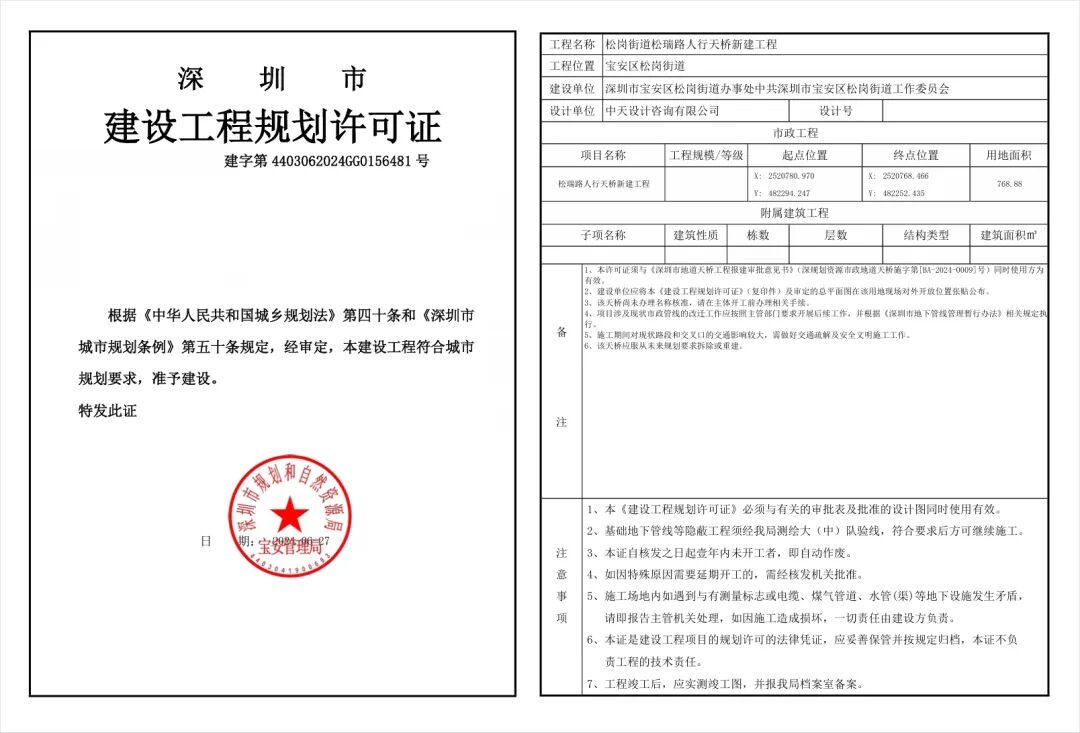 项目规划也获得了批准,2024年7月,深圳市规划和自然资源局宝安管理局发布通告称同意核发“松瑞路人行天桥”项目的《建设工程规划许可证》,并依规对《建设工程规划许可证》及总平面图进行公开。