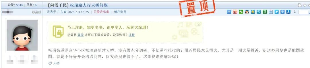 据市民留言内容显示,松岗街道满京华小区松瑞路新建天桥在建设前未开展充分民意调研,项目报批流程存在疑点。周边居民特别是小区一期业主此前进行过多次投诉,但属地街道办及区级发改部门均无法有效解决问题。
