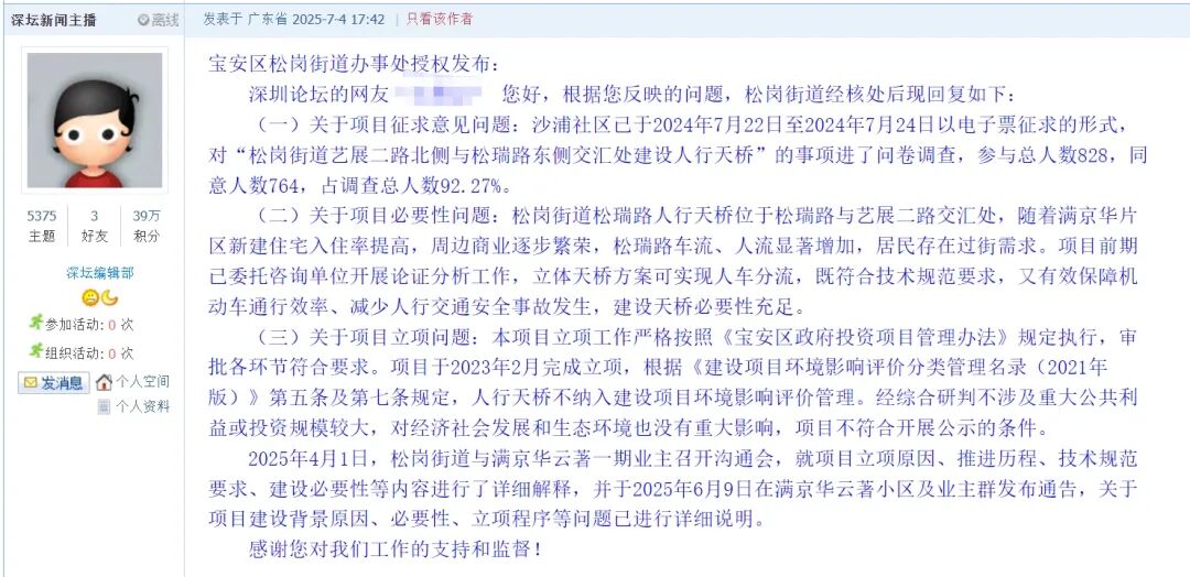 面对市民的质疑,宝安区松岗街道办事处于日前回应表示,沙浦社区已于2024年7月22日至2024年7月24日以电子票征求的形式,对“松岗街道艺展二路北侧与松瑞路东侧交汇处建设人行天桥”的事项进了问卷调查,参与总人数828,同意人数764,占调查总人数92.27%。