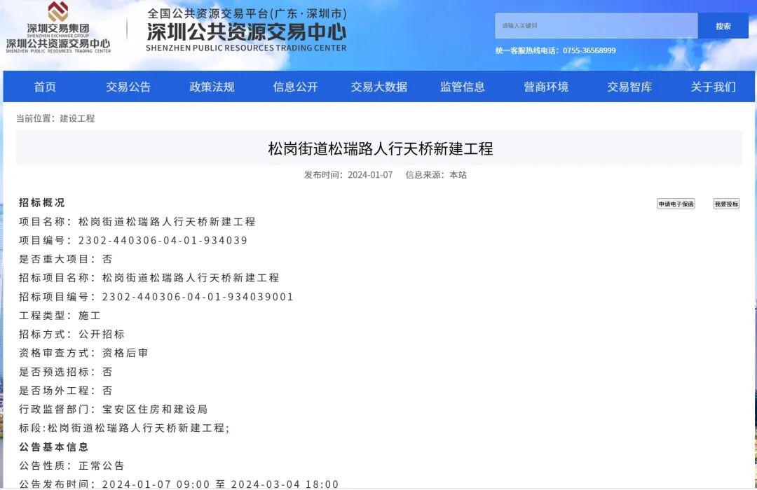 奥一新闻记者注意到,2024年1月,松岗街道办公布招标信息,其中显示松岗街道松瑞路人行天桥新建工程建设单位为深圳市宝安区松岗街道办事处,工程内容主要包括但不限于:桥梁工程、电气工程、绿化工程、电梯、其他工程、交通疏解工程、管线迁改工程等(具体内容详见施工图纸及工程量清单内容),项目计划总投资:1541万元。