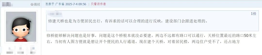 该市民在留言中还指出了松瑞路天桥建设的必要性存疑,据其反映,天桥选址区域周边50米范围内已有路口可供通行,此外,天桥正对居民楼的设置更因占用公共空间而引发了两边居民的不满。