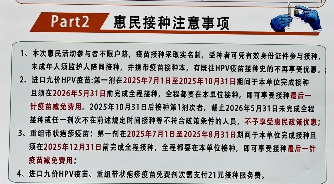 2025年7月5日起,每个疫苗的惠民截止时间各有不同。不限居住地,不限户籍,适龄即可参与;在同一个接种门诊完成接种方享受惠民减免。