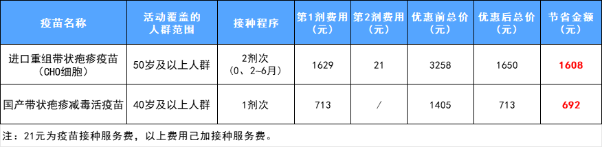 国产带状疱疹疫苗全程接种1剂,享受五折费用,即可减免692元。