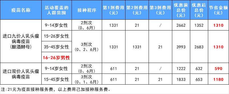 其中,9~14岁女性按照0、6个月的程序接种2剂次,减免第二剂疫苗费用;其余年龄段接种者均按照0、2、6个月的程序接种3剂次,减免第三剂疫苗费用,均可减免1310 元。