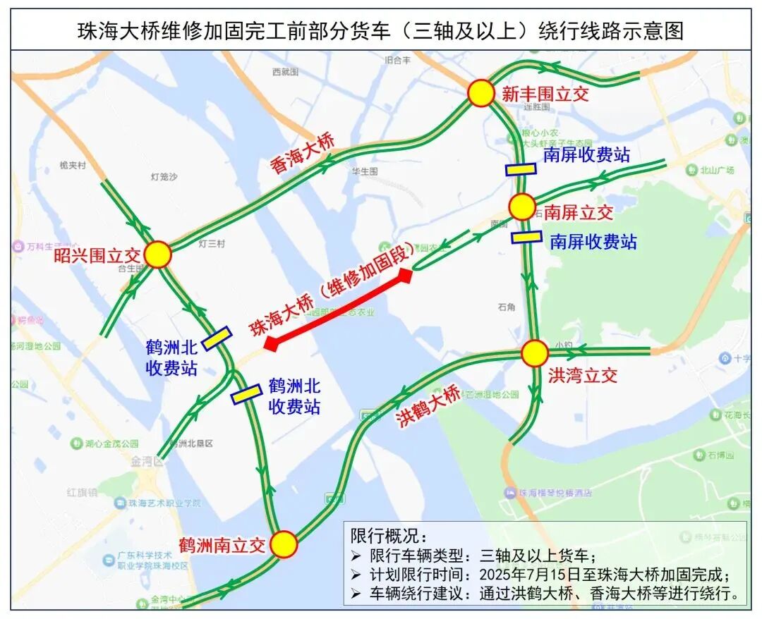 一、7月15日起,全天限制三轴及以上货车通行珠海大桥。限行结束时间结合珠海大桥维修加固工程进度另行发布。