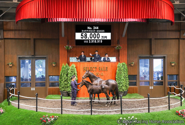 编号344的拍品"Midnight Bizou 2025"(雄,父系:春秋分/Equinox)最终以5.8亿日元(约合人民币2650万元)成交,买主为Nebraska Racing。这匹幼驹的母系是曾斩获2020年沙特杯及五项美国G1赛事冠军的著名雌马“子夜爱意”(Midnight Bisou),其高价成交可谓不负名门血统。