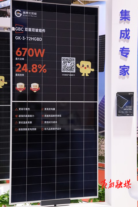 “我们的BC组件光电转换效率达到24.8%。”董晓婷指着产品数据表示。这一超高转换效率可以显著提升土地集约利用率,并且产品适用于高温、水上等严苛环境,更以全黑美学外观满足了高端市场对“性能+颜值”的双重要求。