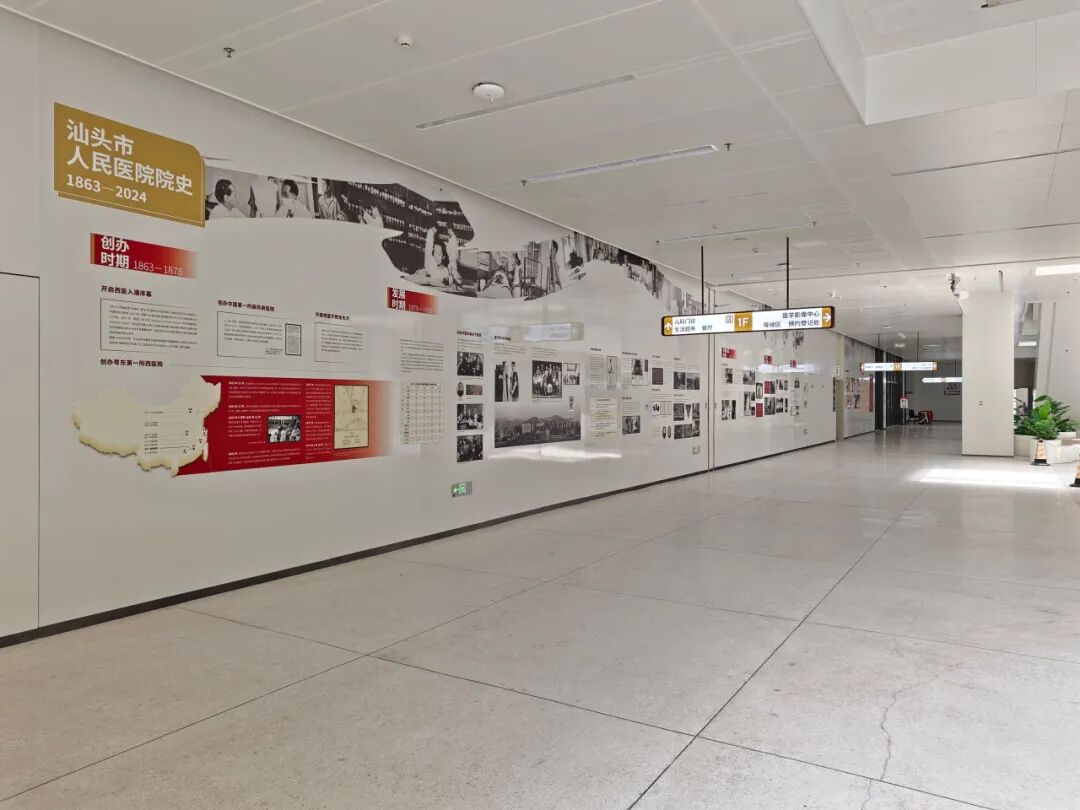 汕头市人民医院主院区医院文化走廊则以时间轴的形式,向过往的患者和群众展示医院的历史脉络和发展轨迹,让人们在就医的同时,也能感受到医院深厚的文化底蕴。