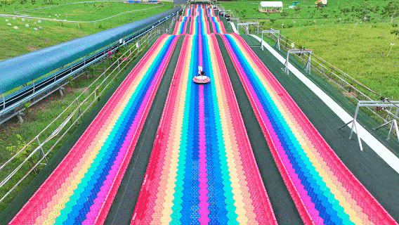 约150米的五彩斑斓滑道,宛如鲜艳的彩虹从高处倾泻而下,让人体验从云端飞驰而下的畅快淋漓,以及一滑到底的速度与激情,尽情享受风一般的快乐。