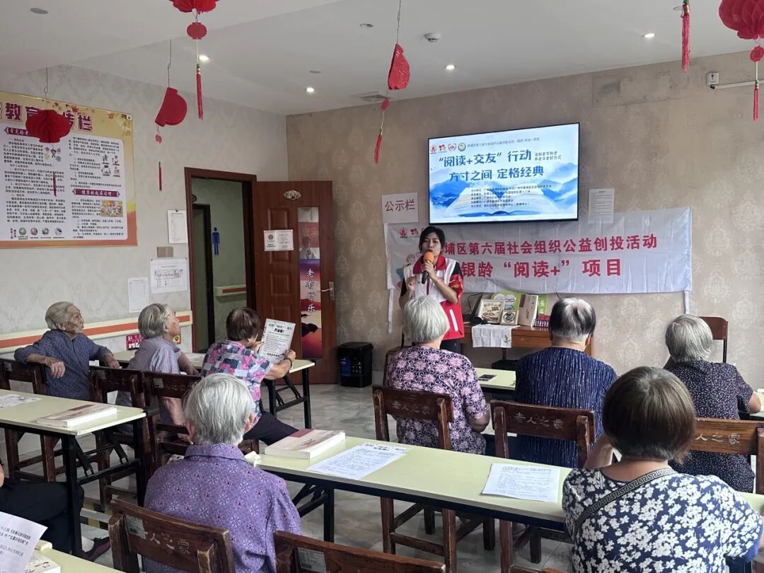 银龄“阅读+”项目以党建为引领,以弘扬中华民族优秀传统文化为主要依据,根据老年人的特点需求、重要时间节点与传统文化相结合,为辖内老人提供丰富多彩的主题性阅读关爱服务活动,帮助他们积极融入社区,丰富他们的晚年生活,满足其精神需求,提高他们的生活质量使其老有所学,老有所乐,老有所为。项目共分五大内容板块,分别是:“一老一小”牵手读书活动、“阅读交友”计划、“银龄领读者”计划、“益”读陪伴+计划、银龄课堂。