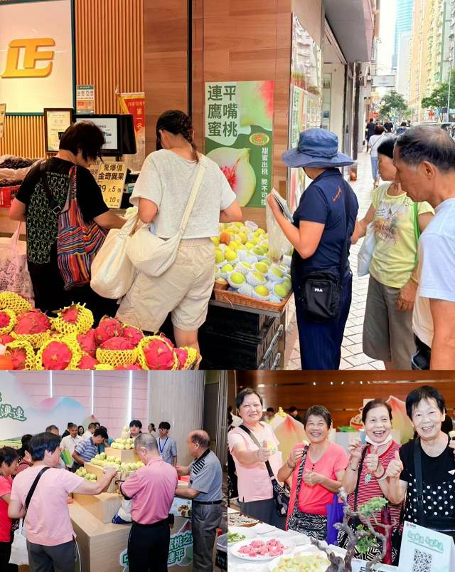 通过南粤集团的纵向帮扶,连平鹰嘴蜜桃已获得出口基地认证,实现“连平采摘—澳门上架”24小时直达。产品快速铺进南粤联丰生鲜超市20多个门店,覆盖澳门全域消费圈。连平鹰嘴蜜桃上架后,以其果大肉厚、清甜爽脆、鹰嘴状独特外形,吸引了众多市民排队选购,成为湾区特色农产品的新宠。