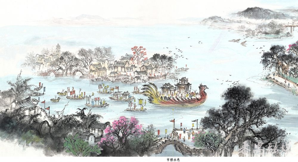 画卷随凤艇展开,据曾海亮介绍,“市桥水色”曾在整个番禺风靡一时,但后来由于多种原因导致该民俗活动消失在人们的视野当中。在创作这幅画作时,他查询了大量的历史资料,最终通过画笔再一次将这一传统民俗活动展现在世人眼前。