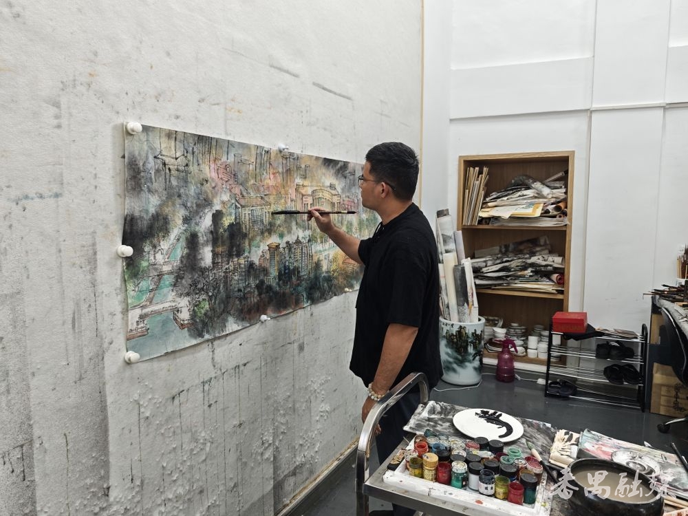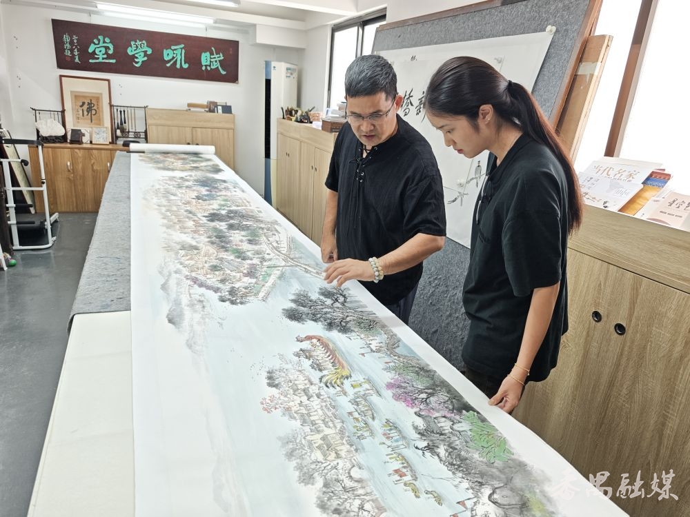 带着对这幅长卷的好奇,记者来到了曾海亮的工作室。推门而入,20米长的画卷正静静铺展在工作台面,画中的市桥河的粼粼波光、凤艇龙舟的灵动姿态、新旧建筑的错落交织,在笔墨间越发清晰。这幅画以“市桥水色”和凤艇开篇,就是想让观众跟着船只的视角,慢慢走进市桥的故事里。”曾海亮指着画卷开篇处对记者说,在他创作时特意遵循“先古后今”的逻辑,让历史与现代的交融更具观赏层次感。