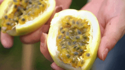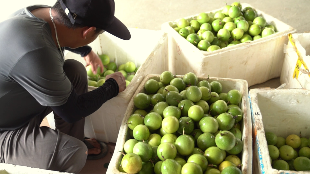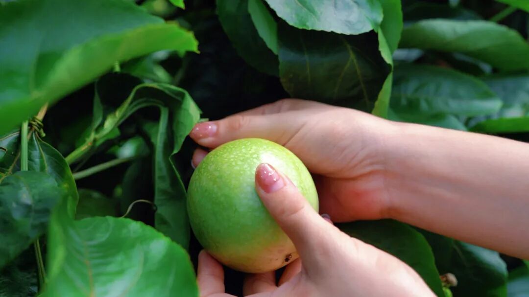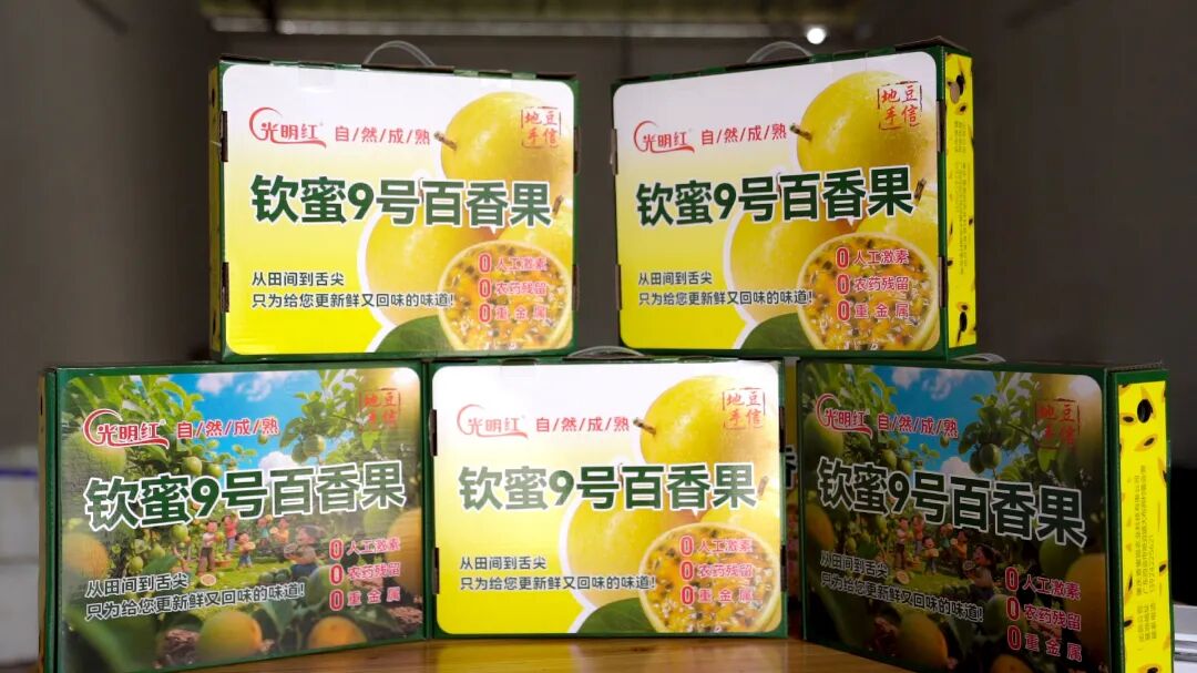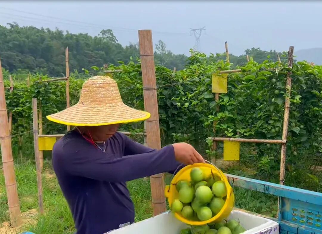 果场负责人张先生告诉小编:“刚采摘下来的黄金百香果呈青绿色,要放置两三天自然转化,待外皮逐渐转黄,此时味道最好。‘钦蜜9号’纯甜无酸,耐储存,还能美容养颜、润肠,市场认可度高得很。”
