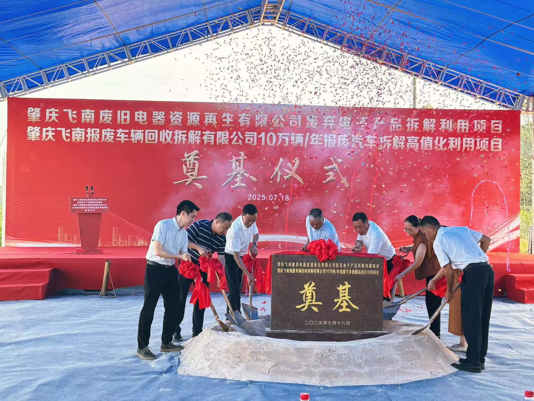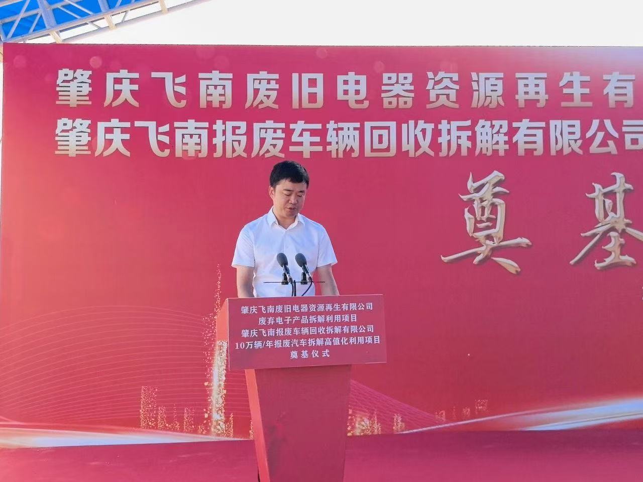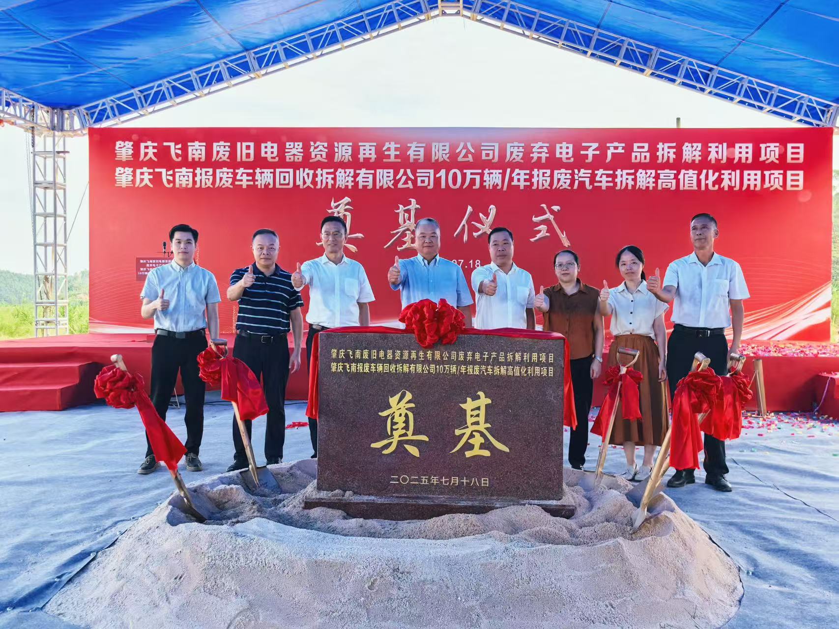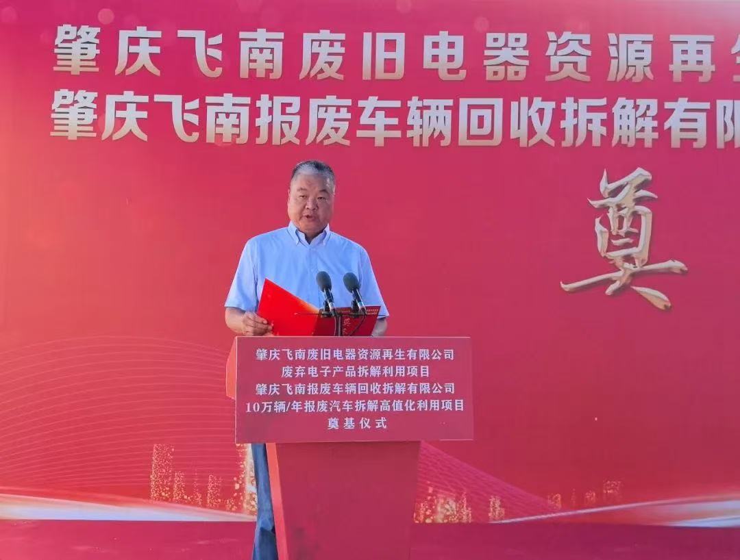 7 月 18 日上午,四会市迳口镇南乡工业小区彩旗飘扬,肇庆飞南废旧电器资源再生有限公司废弃电子产品拆解利用项目和肇庆飞南报废车辆回收拆解有限公司 10 万辆 / 年报废汽车拆解高值化利用项目奠基仪式在此隆重举行。