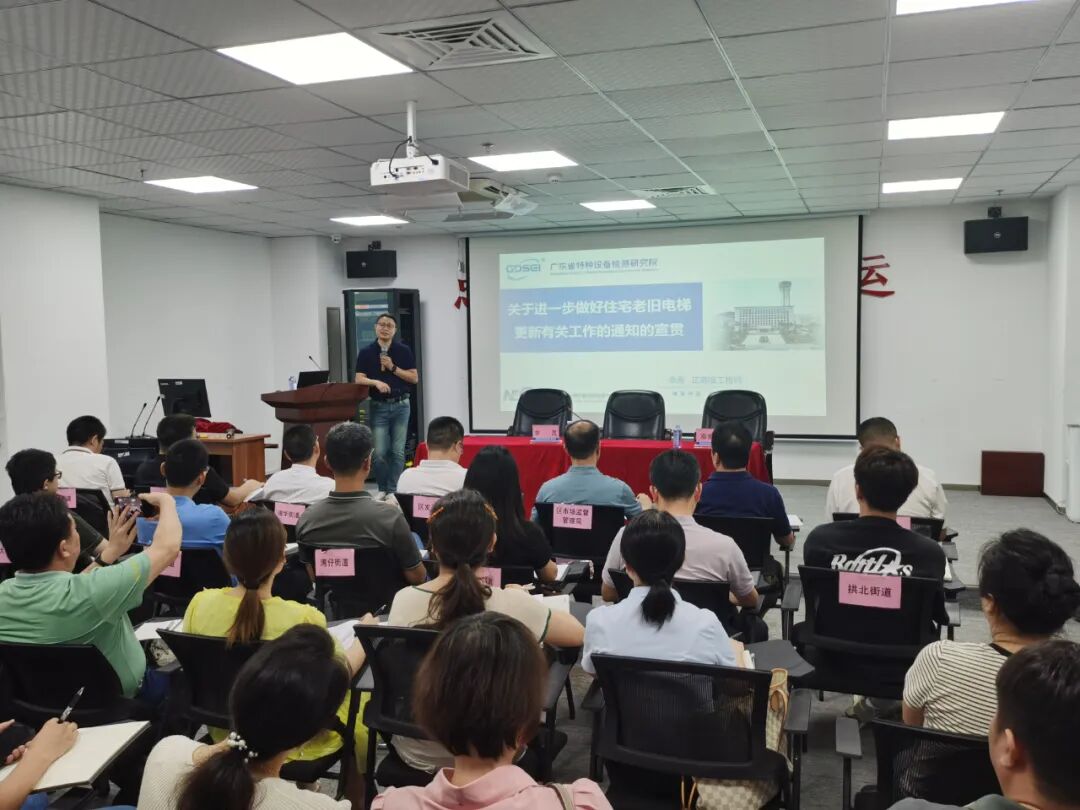 延伸帮扶,提供技术支撑。组建技术服务团队,免费提供申报材料完善、检验问题整改技术指导,累计开展技术指导百余次;举办老旧电梯更新改造政策宣贯会,免费为珠海市各区市场监管局、区住建局、区发改局、街道办等相关单位及电梯生产、销售企业讲解相关政策及技术要求,为全市老旧电梯更新改造注入“加速度”。