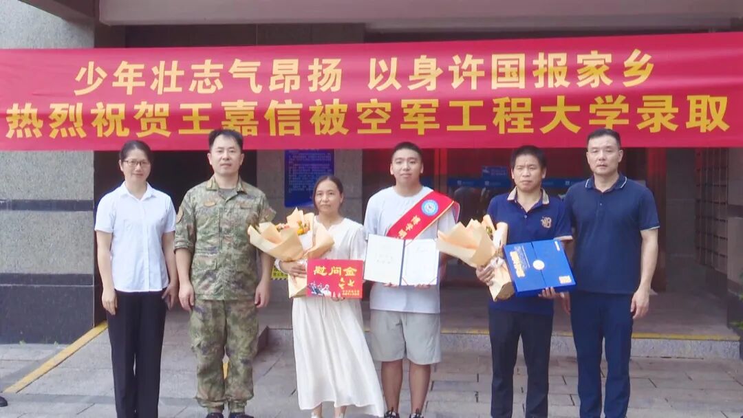现场,杨林为学子及其家人披上绶带,并送上鲜花和诚挚的祝福。被中国人民解放军空军工程大学录取的王嘉信从小就向往部队生活,在得知被军校录取后更是难掩激动之情。