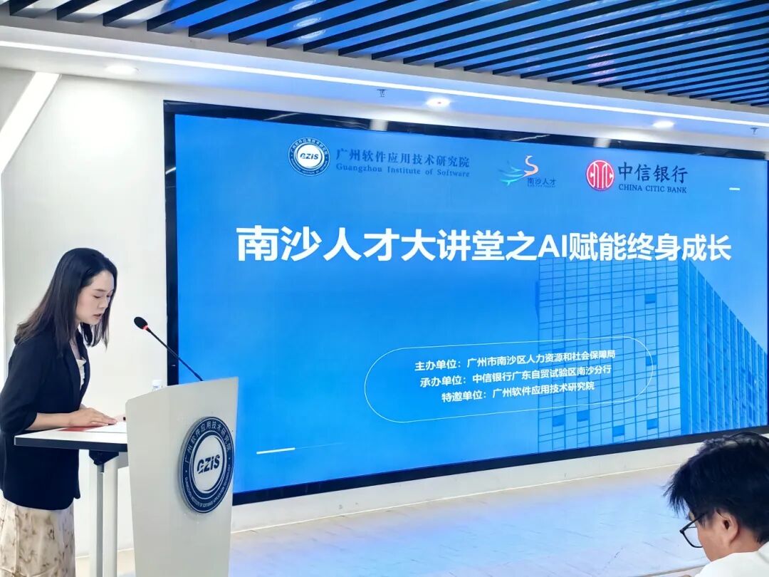 2025年7月19日,以“AI 赋能终身成长”为主题的南沙人才大讲堂主题分享活动在广州软件应用技术研究院(简称:广州软件院)路演厅成功举办。本次活动由广州市南沙区人力资源和社会保障局(简称:南沙区人社局)主办、中信银行广东自贸试验区南沙分行(简称:中信银行南沙分行)承办,并特邀广州软件院人工智能实验室陈振冲教授作为此次活动主讲嘉宾。80余位南沙精英人才齐聚一堂,共同探索AI与教育深度融合的无限可能。