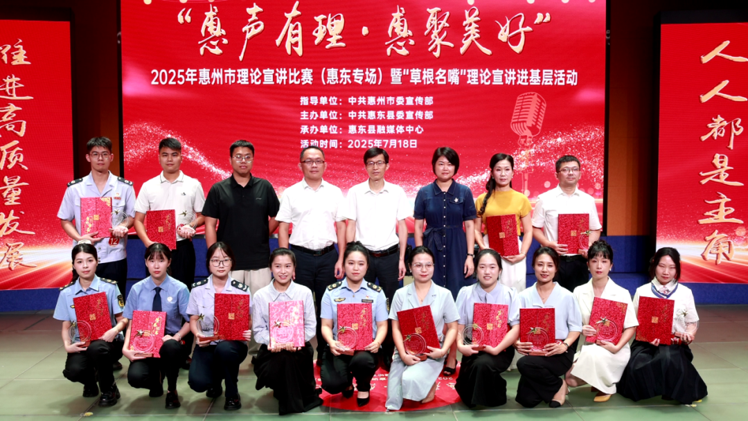 7月18日,“惠声有理·惠聚美好”2025年惠州市理论宣讲比赛(惠东专场)暨“草根名嘴”理论宣讲进基层活动在惠东县融媒体中心演播厅举行。惠东县委常委、宣传部部长黄利勇,惠州市委宣传部有关领导同志、各镇(街)宣传委员、历届“草根名嘴”代表、惠东县直特色宣讲队代表等现场观看比赛。