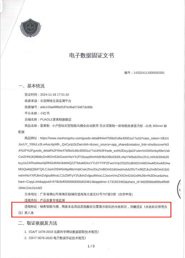 2024年11月29日,南海区市场监督管理局(以下简称“该局”)接上级交办线索,反映某卫浴有限公司(以下简称“当事人”)在小红书平台开设的“某旗舰店”内,销售列入《水效标识实施目录》的坐便器及智能坐便器产品时,未在商品信息展示主页面显著位置展示水效标识。经查明,当事人自2023年8月起销售相关产品时,主观上存在规避展示水效标识的意图,以防止消费者据此进行比价采购。该行为违反《水效标识管理办法》(国家发展改革委、水利部、质检总局令第6号)第八条之强制性规定。