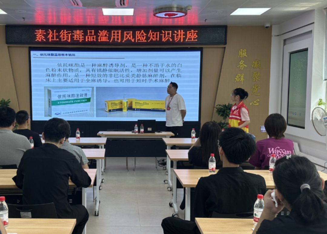 此外,工作人员在讲解中同步展示仿真毒品模型,并向参与培训人员派发宣传单。针对新型毒品在娱乐场所的渗透趋势,工作人员特别聚焦“依托咪酯“”右美沙芬“等物质,结合其“混入饮料不易察觉”“短期使用易成瘾”等隐蔽性危害特点,反复提醒在场人员:“面对陌生人提供的食品饮料务必保持警惕,一旦发现可疑物品立即联系管理人员或报警。”