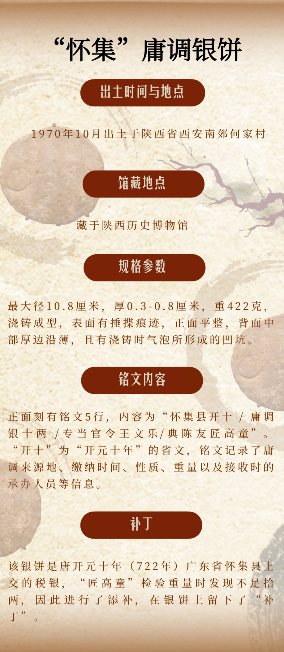 1970年10月,某工程队在西安南郊的何家村,挖出了窖藏的两瓮一罐。1000多件深埋地下千年的金银器、玉器、贵重药物、中外钱币、铜器呈现在眼前。其中就有“怀集”庸调银饼和“洊安”庸调银饼。
