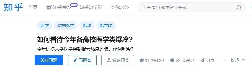 在社交平台上,“临床类专业降温”等已成为网友们热议的话题之一。有网友表示医学类专业“爆冷”,甚至“临床马上和土木一桌了”,称医学学制较长,学医的辛苦程度远超普通专业,再加上扩招、学历越来越卷等因素,造成了这一现象。