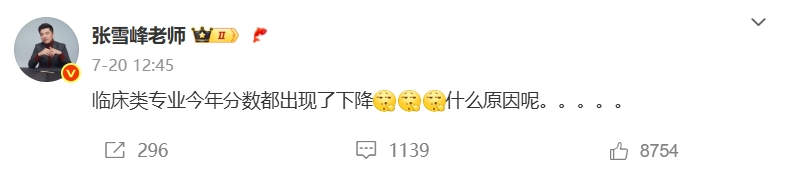 就临床医学等专业而言,7月20日,教育大V“张雪峰老师”在微博公开表示,“临床类专业今年分数都出现了下降……”