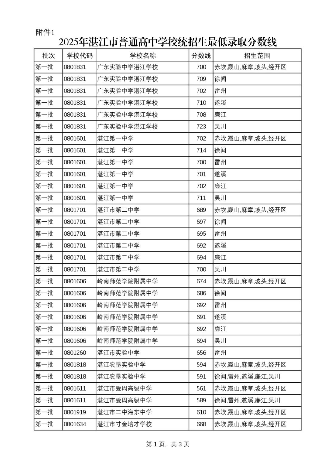 各普通高中学校统招生录取分数线详见附件1。