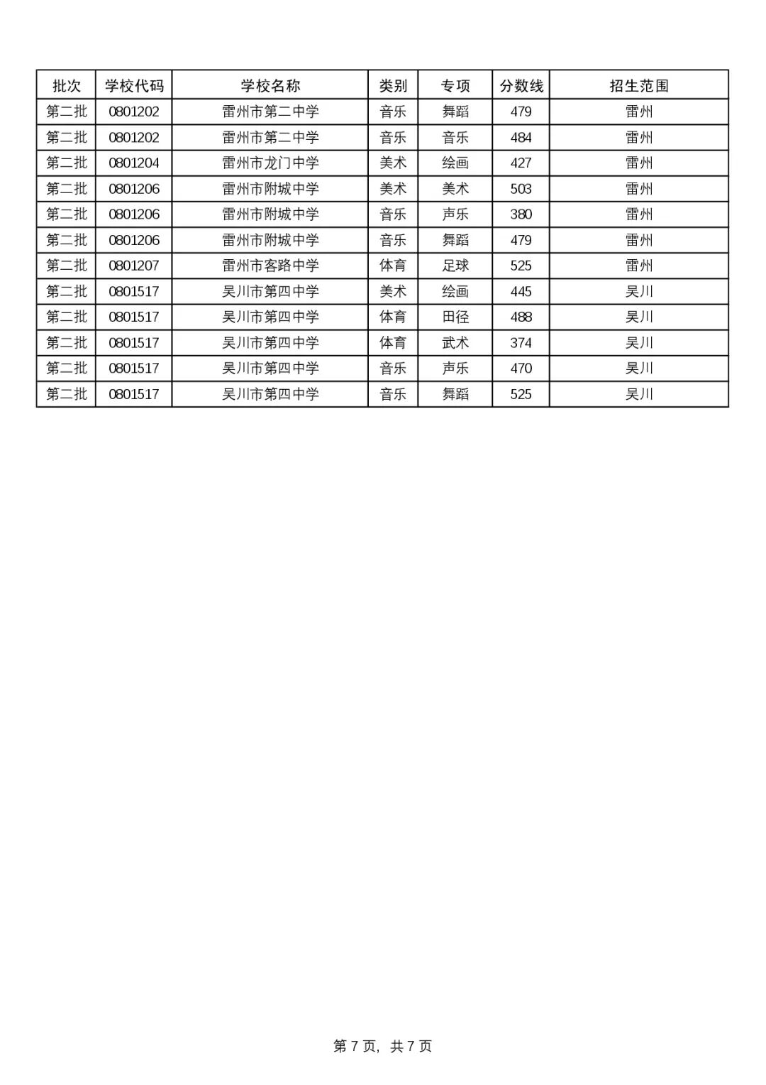 (三)特长生最低录取控制分数线
