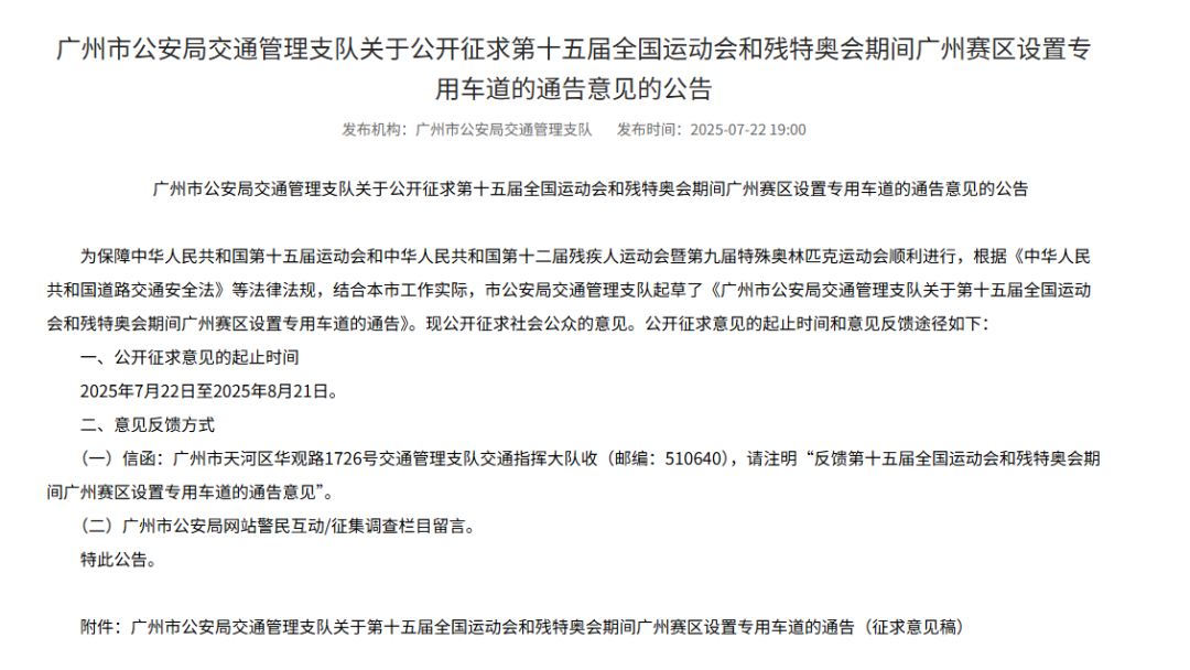 7月22日,广州市公安局发布公告,就《广州市人民政府关于第十五届全国运动会和残特奥会期间广州赛区实施机动车临时交通管理措施的通告(征求意见稿)》公开征求社会公众的意见。公开征求意见的起止时间为2025年7月22日至2025年8月21日。