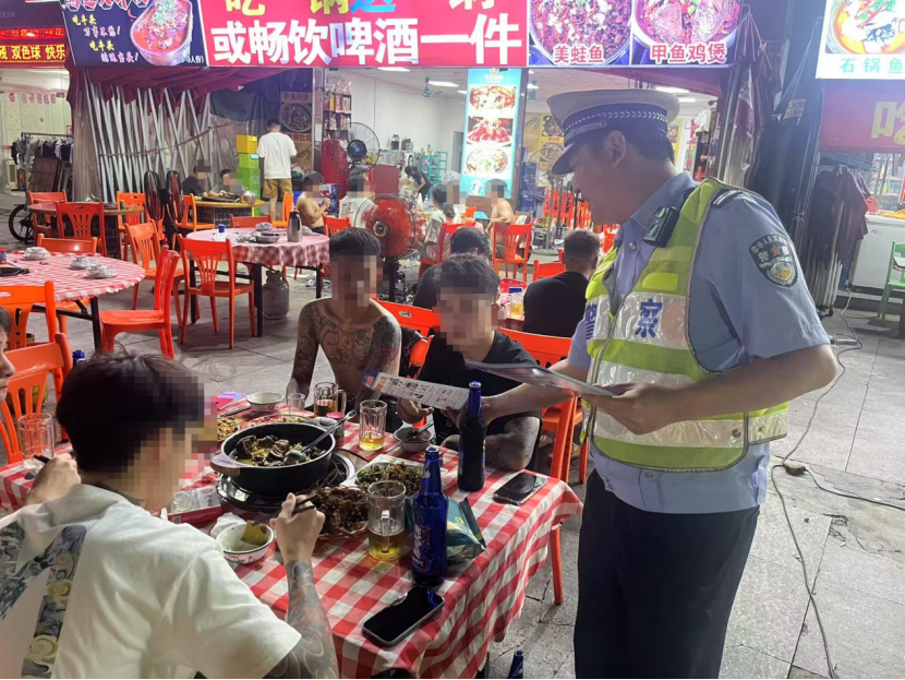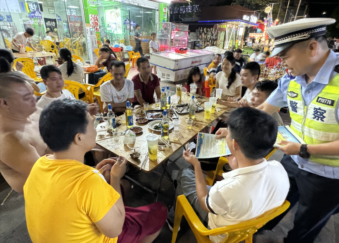 夏季天气高温炎热,酒驾醉驾风险隐患突出。为有效遏制涉酒交通事故发生,行动中,东莞交警持续组织宣传人员走进辖区宵夜街、大排档、饭店等餐饮娱乐场所开展宣传活动,以实际行动提醒市民“开车不喝酒,喝酒不开车”。