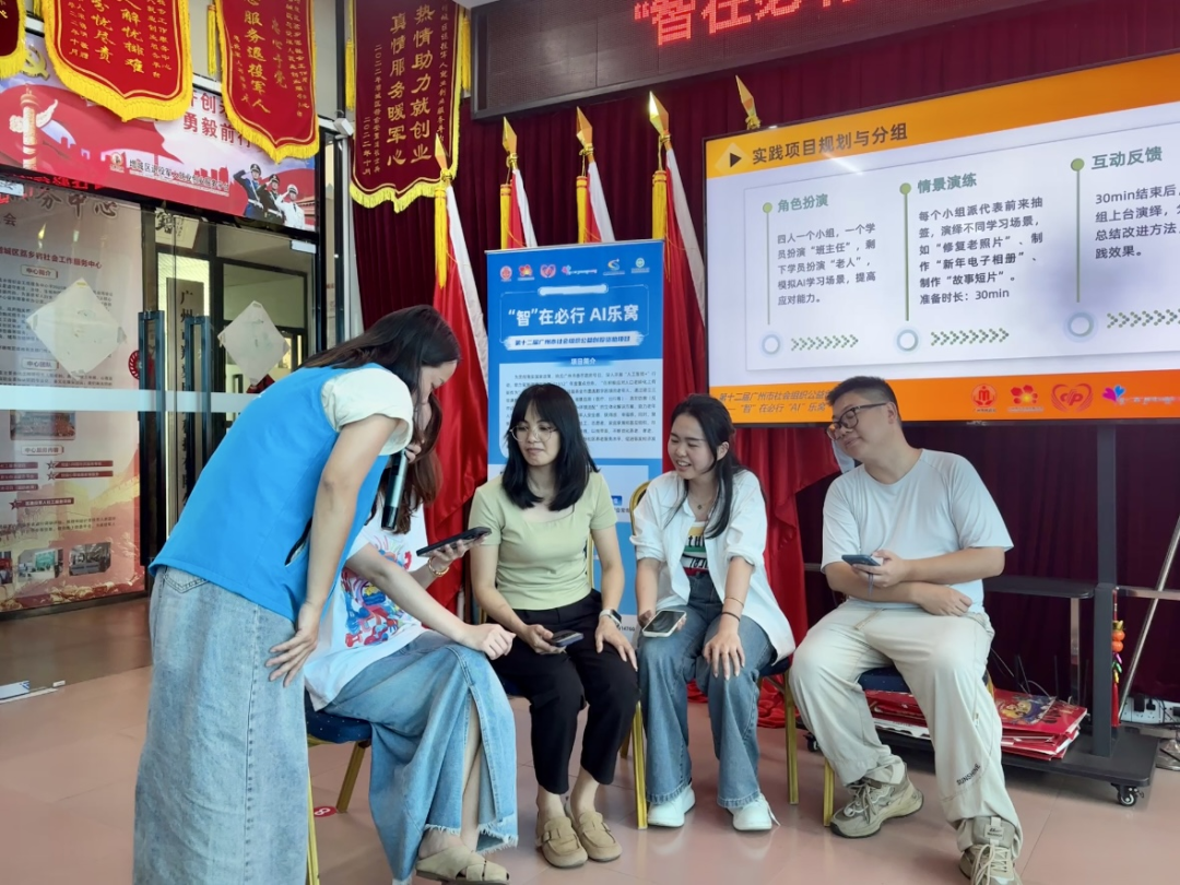 场景模拟中,各小组按讨论好的方案执行,由一人扮演活动老师,其他人扮演参加AI 主题沙龙的老人。“老人们”不断提出问题,“老师”则针对老年人在学习AI技术知识时可能遇到的各种问题,运用所学的沟通技巧和 AI 知识进行耐心解答与指导。现场互动频繁,大家在实践中不断调整服务方式,锤炼服务技巧。