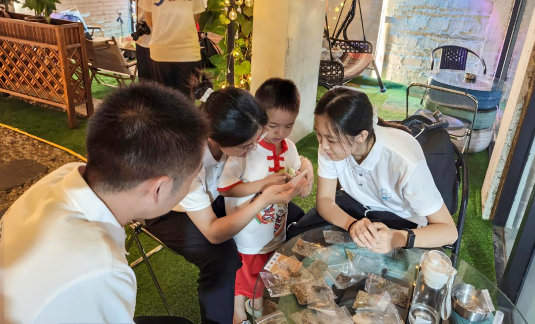 手作中药香囊、观察舌苔、把脉问诊……现场活脱脱像个“健康小集市”,广东药科大学附属第一医院(第一临床医学院)南药种芯突击队的队员们个个撸起袖子“露绝活”。在中医体验区,队员们现场教学,手把手教授脉象辨别技巧,透过舌象解读亚健康信号,解锁身体“健康密码”,掌握“自检”小技能。队员边把脉边问:“最近是不是总熬夜?看你舌边有齿痕,舌苔偏厚,平时要少喝冻饮,尽量晚上十点半前睡觉。”话音刚落,正体验肩颈按摩的学员突然直起腰:“哎!我这脖子刚才还僵得转不动,现在怎么这么轻松?”