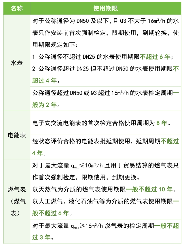 民用水表、电能表以及燃气表有使用期限,到期需要轮换(其中电能表可根据其性能状态延期使用)。